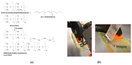 (a) Equation depicting the cross linking mechanism between PDMs and Butyl Rubber; (b) 90° peel measurement of PDMS from BR-PI interface depicting stringing effect [7].