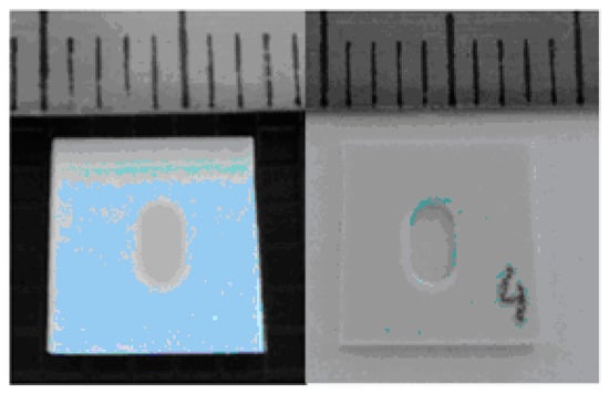 Photo of high-resistance part of microheater is presented in Figure 4. The width of the lines ranged from 30 to 60 μm, Pt thickness—from 1 to 2 μm, heater resistance—from 20 to 60 Ohm. To get cantilever shaped microhotplate, LTCC membrane surrounding Pt heater was cut away by 10 W laser (λ = 1.06 μm). Resulting chip with 3 mm hole and microheater cantilever suspended in this hole has dimension of 6 × 6 mm.