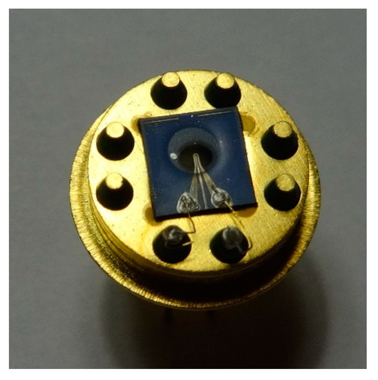 We used in our work much thinner, specially prepare by company “Istok” (Fryasino, Russia), 20 μm thick LTCC ceramics stretched on LTCC frame with hole (100 μm thick, Figure 2). This last was used to make the sensor chip robust enough. The sensor was assembled in TO8 holder (Figure 3).