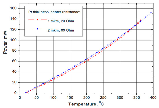 The result presented in Figure 6 means that the main mechanism of heat dissipation by the microhotplate is related with the heat conductivity of LTCC substrate itself, but not by the heat conductivity of sintered metallic platinum. Otherwise, the power consumption of the microheaters with different platinum thickness would be significantly different.