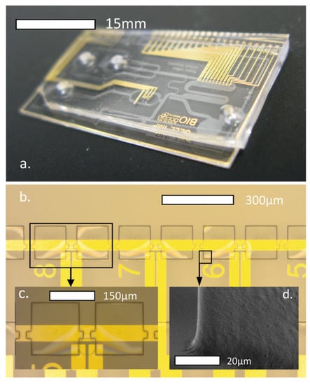 Metal (Au) electrodes integrated in SU-8 based hybrid microfluidic system (a); For proper alignment, electric insulation and transparency the channels are formed in multi-layered SU-8 (b,c); SEM view presents the interface between the thin insulation and the thick channel forming SU-8 layers (d).