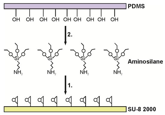 Schematic molecular level representation of the bonding process between the SU-8 and PDMS surface: 1. Silanization of the SU-8/2. OH groups of hydrolized APTES molecules react with the silanol groups of plasma treated PDMS surface.