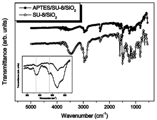 The change of the surface chemistry due to the silanization process of SU-8 (using APTES: (3-Aminopropyl)triethoxysilane) is represented by its IR spectra in Figure 4.