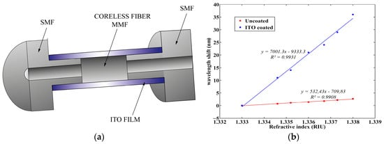 (a) Etched SMS structure with an ITO thin film deposition; (b) Wavelength shift with refractive index uncoated and ITO coated.