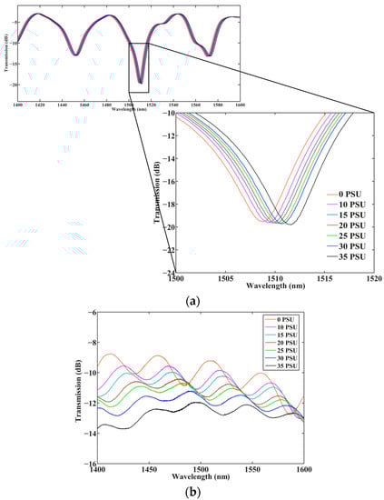 (a) Transmission for 25 µm diameter SMS structure uncoated structure as a function of wavelength for different saline concentrations; (b) Transmission for 25 µm diameter SMS structure ITO coated structure as a function of wavelength for different saline concentrations.