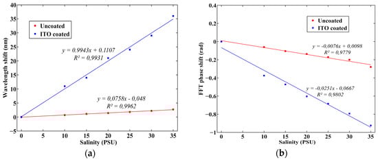 Figure 3a,b shows the behavior of the wavelength shift and the phase shift for different salinity concentrations and the contrast of the behavior without and with ITO film. The calculated sensitivities were 0.076 nm/PSU and −0.007 rad/PSU for the etched SMS, and 0.99 nm/PSU and −0.025 rad/PSU for the etched and ITO-coated SMS.