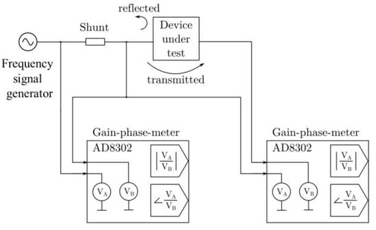 The measurement principle of the portable SAW impedance meter (SIM), as shown in Figure 1, comprises of the direct measurement of gain and phase of the SAW sensor referred to a reference resistance which allows the calculation of the impedance spectrum XSAW, as shown in Equation (2):