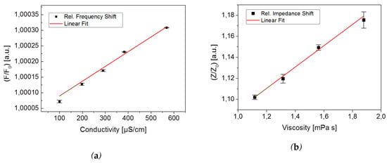 The experiments were carried out by applying different fluids in a continuous flow over the sensor area. The flow rate for all fluids was adjusted to 0.2 mL h−1 using syringe pumps (LA-100, HLL Landgraf Laborsysteme, Langenhagen, Germany). All experiments were carried out in a clean room environment at a room temperature of 22 °C. In order to evaluate the sensor performance, the sensor was treated with phosphate buffered solution (PBS) of different conductivities or glycerin solutions of different viscosities, respectively. From the calibration curves in Figure 2a,b sensitivities for conductivity of 64 Hz/S cm−1 and for viscosity of 122 mΩ/mPas were obtained, respectively.