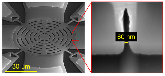 (a) SEM image of a released WGD with radius 30 µm vibrating at 41.086 MHz; (b) FIB cross-section of the air-gap designed at 100 nm. The measured gap is narrower due to the material redeposition on the structure sidewalls during the FIB etching.