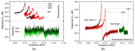 (a) S21 response with capacitive and piezoresistive detection methods of a 100 nm air-gap WGD resonator; (b) S21 response comparison of two WGD resonators with different nanometric air-gaps (100 nm and 300 nm) with piezoresistive detection. RF power −20 dBm.