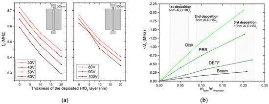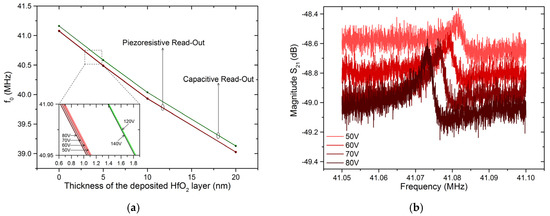 (a) S21 response of a DETF resonator for uncovered (right) and 20-nm HfO2 ALD covered (left) cases; (b) Transmission signal level worsening after each HfO2 ALD (Vbias = 90 V).