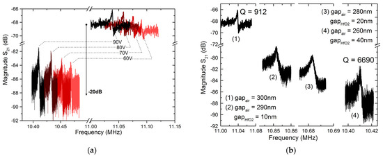 The successive HfO2 depositions have caused a slight impoverishment of the probes-electrodes contact, worsening the transmission response level up to −20 dB while keeping similar SNR levels (Figure 4a). A gain up to ×7.3 in the Q has been achieved for the partially-filled gaps DETF resonator after the first HfO2 deposition (Figure 4b), overcoming the surface losses reported by [7].