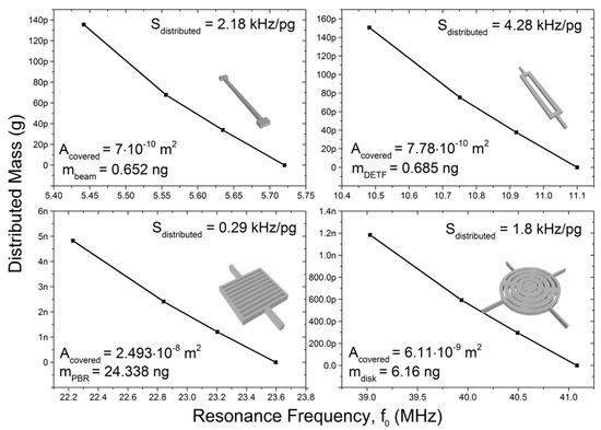 Distributed mass sensitivity slopes have exhibited a linear frequency downshift with the added mass (Figure 5). Mass sensitivities of 4.28 kHz/pg for DETF and 1.8 kHz/pg for bulk WGD devices have been reported for the first time for partially-filled-gap resonators (Figure 6), values comparable to the ones presented in recent literature for MEMS resonators [3,8,9].