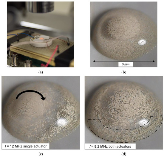 Preliminary tests have been conducted to verify the ability of the generated acoustic waves to manipulate fluid drops and particles. The device has been placed under the microscope and a water drop with dispersed light-reflective microspheres has been placed on the alumina substrate between the actuators to acquire by a cam the generated fluid and particle motion, as shown in Figure 3a. The comparison between Figure 3b and 3c shows that circular vortex rotations have been obtained in the drop by exciting a single actuator with a sinusoidal signal at frequency of 12 MHz. By exciting both the actuators at frequency of 8.2 MHz and phase difference of 0°, particle accumulation along circular lines caused by the standing waves generated in the drop has been obtained, as shown in Figure 3d.