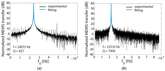 The first experimental characterization of the proposed device has been carried out through the MEMS Characterization Platform from ITmems srl, a tool specifically developed for testing capacitive accelerometers and gyroscopes. The natural frequencies and the quality factors of the two modes of the gyroscope are obtained by fitting their frequency responses (Figure 2). A good agreement in terms of quality factor is obtained, while the differences in terms of frequencies can be ascribed to an over etch larger than the target value.
