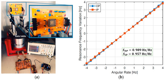(a) Experimental set-up: the MEMS and the IC are stacked and wire-bonded in a socket (close-up view), and then placed on the rate table; (b) Measured resonance frequency variation as a function of the rate, for both OP and IP modes. Scale factor errors are greatly reduced when measuring the sum of both axes variations [2].