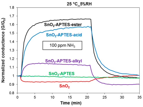 The sensor response of SnO2, SnO2-APTES, SnO2-APTES-alkyl, SnO2-APTES-acid and SnO2-APTES-ester to 100 ppm of ammonia gas balanced with humid air (5%RH) at 25 °C. G is the conductance at any time and G0 is the conductance at the beginning of the test (t = 0).