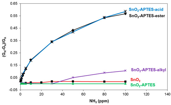Relative response of SnO2, SnO2-APTES, SnO2-APTES-alkyl, SnO2-APTES-acid and SnO2-APTES-ester sensors versus ammonia concentrations in 5%RH air at 25 °C.