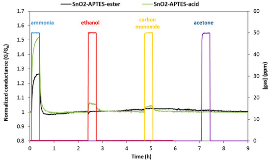 Concerning the selectivity of ester and acid modified sensors, Figure 3 shows that the SnO2-APTES-ester sensor has almost no change in conductance upon exposure to 50 ppm of ethanol, carbon monoxide and acetone at 25 °C. This means that ester modified sensor is selective to ammonia, at least in regards of the three tested gases. However, acid modified SnO2 shows less selectivity than ester modified sensor versus ethanol and carbon monoxide. This particular selectivity derives from the unique interactions of the grafted layer on SnO2 with ammonia gas.