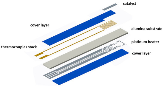 Many applications require high-temperature stable and highly sensitive hydrocarbon (HC) sensors, especially for automotive exhaust applications [1,2,3,4]. In previous works, a sensor based on the thermoelectric principle was successfully tested for application in automotive exhausts [4,5]. Such sensors are built as follows: On the front side of a ceramic substrate, two conducting materials (here: gold and platinum) are screen-printed to form a stack of thermocouples (thermopile). The area of one junction is covered with an inert layer whereas the other one is coated with a catalyst (Figure 1).