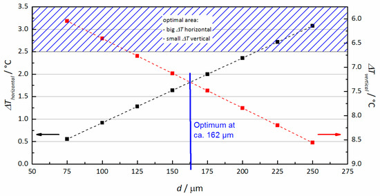 The design of the sensor was supported by FEM analysis. The main goal of the FEM analysis was to find an optimal LTCC layer thickness at which the sensor signal becomes as high as possible (temperature difference ∆Thorizontal between catalytically active layer and inert layer). At the same time, the vertical temperature difference ∆Tvertical between front and reverse side of the heater area should be as small as possible. The simulation results are summarized in Figure 2.