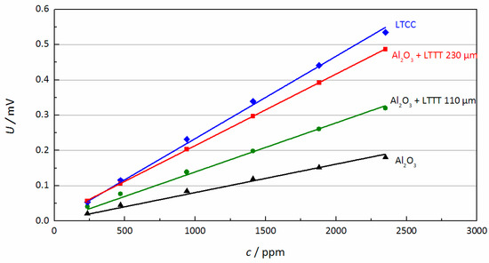 As mentioned above, we manufactured two different types of sensors to measure the influence of LTTT layer thickness on the sensor sensitivity: 110 μm and 230 μm. Upon the LTTT, the thermopile structure (Au/Pt, 15 thermocouples in series) as well as the catalyst (alumina with 1 wt % Pt) were screen-printed and fired (Figure 3).