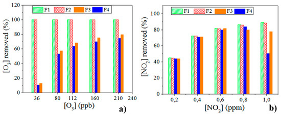 Amount of gas removed by the four filters F1, F2, F3 and F4 as a function of initial concentration: (a) under O3 and (b) under NO2.