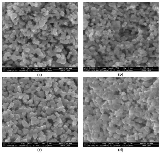 Surface morphology of the cured ceramic sensors were determined by means of Field Emission Scanning Electron Microscopy (FESEM) and illustrated in Figure 1a–d. The micrographs revel that grains are grown by additive surcharges. Homogenous distribution of dopant nanoparticles are seen. All the films are well developed with sufficient degree of porosity. By increment of magnesia dopants the grains size had matured with slight decrease of porosity. The most porous body can be seen in Figure 1a as pure ZST and follows by ZST doped with different MgO concentrations in Figure 1b–d, respectively. The MgO nanoparticles (size of about smaller than 40 nm) were added to ZST as surface conductivity-enhanced agents and there was an expectation to atomic reduction of open cavities. Average grain size of the samples can be found in Table 1.