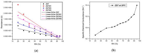 Figure 2. (a) Resistance change of the sensors versus relative humidity of 20% to 95% RH at room temperature fitted with the linear lines; (b) humidity dependency of the bulk electrical conductivity for humidity range of 20%–95% RH at room temperature for the ZST micro sensor.