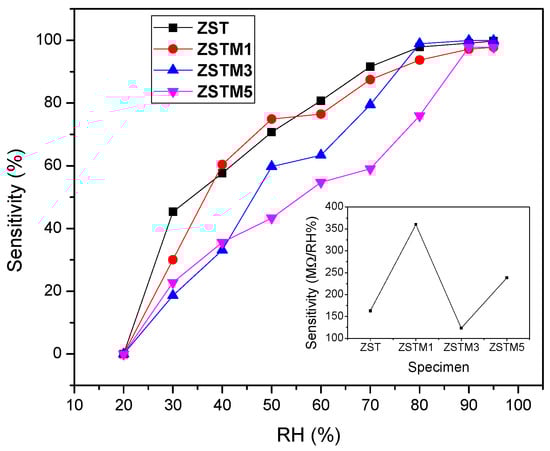 RH and RD represent the resistance at 95% to 20% RH and resistance at 20% RH, respectively. As shown in Figure 3, all the specimens exhibit logarithmic behaviour in entire RH range with ZSTM3 as most sensitive transducer with 99.94% change.