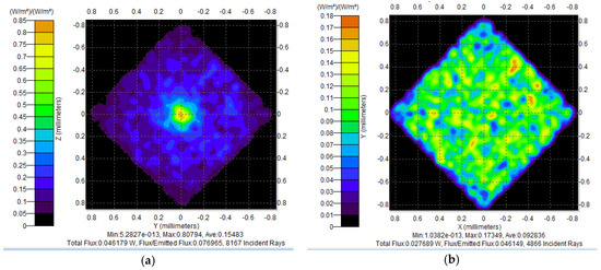 Simulation results of the irradiated infrared energies at the active areas of thermopile detector: (a) full elliptical structure, (b) partially blocked (6 cm) elliptical structure.