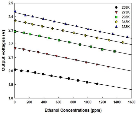 The output voltages of ethanol sensor (at the full elliptical structure) are presented in Figure 3 as a function of ethanol concentrations and ambient temperatures from 253 K to 333 K. They are regressed as exponential equation as presented in Equation (2),