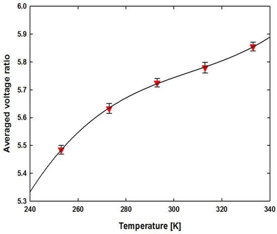 Averaged ratios of output voltages of dual-elliptical ethanol gas sensors ranging from 253 K to 333 K temperatures.