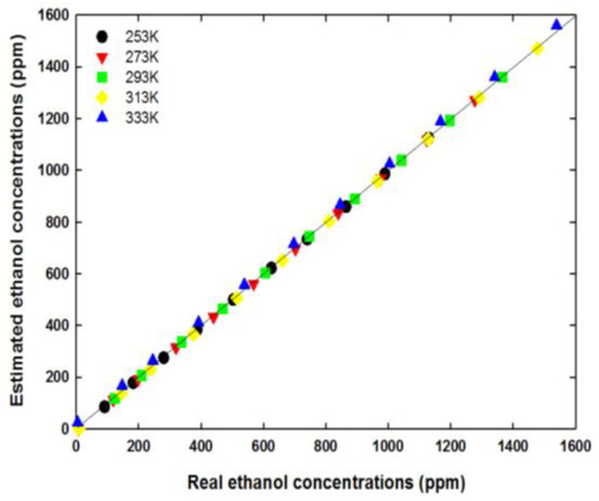 After implementing the temperature compensation algorithm [4] and offset values according to the variations of ambient temperatures, the estimated ethanol concentrations could be presented as in Figure 5. Due to the differences of initial values between the measurements and the regressions, the errors below 100 ppm ethanol gas were little high around 15%. However, above 100 ppm ethanol concentrations, the range of average estimation errors was between −1.2% to 3.0% from 253 K to 333 K temperature variations and within the tested ethanol concentrations.