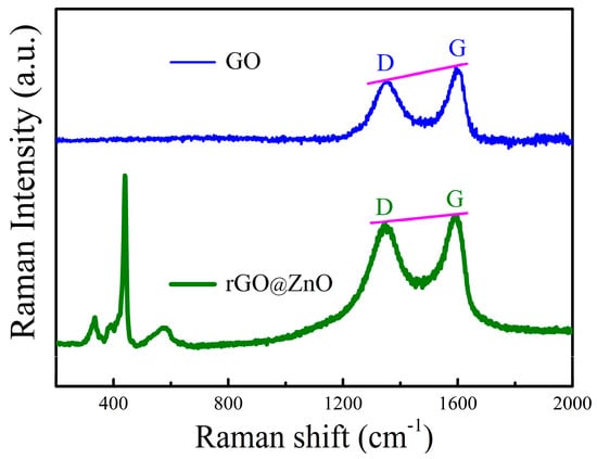Raman spectra of the GO suspension and rGO@ZnO composites.