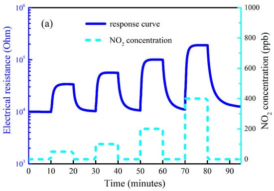 The gas sensing test is carried out in a home-made gas sensing chamber. A Teflon-lined box installed with different lights is used as the gas sensing chamber, and the sensors were set in front of the light sources. Prior to the test, 1000 mL/min synthetic air is introduced into the measuring system. When the base resistance is stable, a certain flow rate of NO2 gas is injected. After the response is finished, the target gas is removed. All the gas sensing test is performed at room temperature.