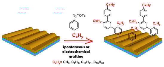 Alkylphenyl functional groups were grafted spontaneously by soaking of the freshly sputtered Au films in 1 mM solutions of corresponding ADTsin deionized water for 10 min. Electrografting of ADTs was performed in 1mM water solutions of corresponding ADTs under the potential −2 V for 10 min. After modification the metal substrates were rinsed under sonication sequentially with deionized water, ethanol, and acetone for 10 min and dried in desiccator for 3 h.
