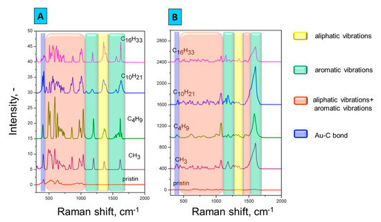 To confirm the ADTs grafting, Raman spectroscopy was applied. Figure 2A,B show the spectra obtained after the spontaneous and electrochemically induced modification of the prepared gold grating surface. The measured intensity of spontaneously modified substrates (Figure 2A) was noticeably weaker than in case of electrochemically modified samples (Figure 2B), whose responses ranged in the order of hundreds. Results of Raman spectroscopy performed after the ADTs grafting indicate the presence of characteristic adsorption bands, vibrations of aromatic ring 1600–1640, 990–1090, 510–710 cm−1 and vibrations of aliphatic chains 1355–1390, 1050–1070, 720–860 cm−1.