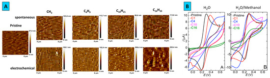 (A) Surface topography of pristine and modified by ADTs surfaces, (B) Cyclic voltamperometry of pristine and electrochemically modified samples.