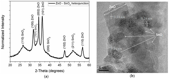 Figure 1a displays the XRD pattern of ZnO/SnO2 heterojunction, being all peaks indexed to crystalline ZnO and SnO2 phases, respectively. HRTEM image obtained from the ZnO/SnO2 heterojunction showed that the microstructure consists of SnO2 nanoparticles (of ca. 5 nm), coalesced over ZnO rod-like structures of ca. 13 nm, as illustrated in Figure 1b. Additionally, Figure 1b revealed the existence of junction between ZnO and SnO2 nanoparticles, indicating the formation of junction between the oxide semiconductors.