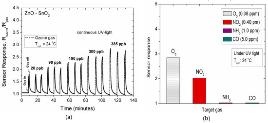 Figure 2a presents the gas sensor responses of the ZnO/SnO2 heterojunction exposed to various O3 levels under continuous UV irradiation.