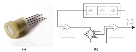 Figure 1b shows the scheme of test stand. The scheme consists of (1) AduC831 microcontroller with two 12-bit DAC (Digital-to-Analog Convertor) and 8-channel 12-bit ADC (Analog-to-Digital Convertor). DAC is used to set sensor supply voltage. Power supply for sensor is based on (2) an operational amplifier working as a voltage follower. (3) In measuring part, working and compensative sensitive elements are installed in a Wheatstone bridge. (4) Amplifying part is built on the AD8532 working as a differential amplifier. As a data acquisition system there used universal input/output PCI-board L-791 produced by L-card. It has 32 analog input channels with 14-bit ADCs and the sample-rate 400 kHz.