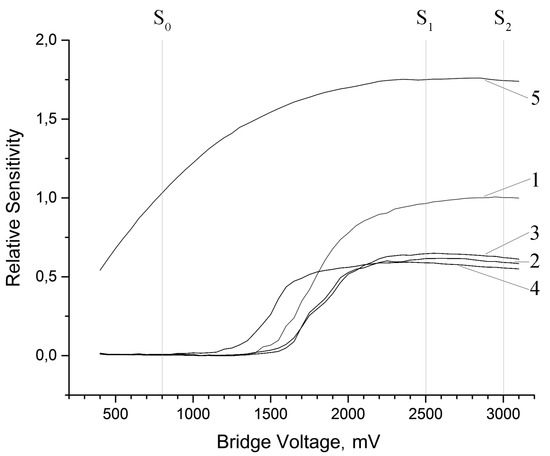Figure 2 presents averaged response of the sensors. At the beginning, when temperature is not sufficient for catalytic reactions, sensitivity of the sensor is zero. Then, after reaching the initial temperature of oxidation reaction, the sensitivity increases with sensor temperature. Oxidation in this zone has kinetic character, as a result the sensitivity is non-linear, i.e., it depends on concentration of the analyzed gas. With increasing temperature, the oxidation becomes diffusive, that is all amount of gas able to reach the surface of catalyst is oxidized. In a diffusion zone a section, where sensitivity does not depend on temperature change, is selected. It is the working temperature of sensing element. Further increase of temperature causes fall of sensitivity associated with both the increase of heat transfer (e.g., by radiation) and the properties of particular reaction, the specific properties of the oxidizing gas (e.g., desorption energy of the fuel component from the surface of the active site of the catalyst).