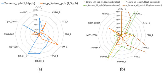 As expected, the PID sensors (PID-AH and Tiger Select) showed the most important sensitivity to interfering compounds in terms of number of species. In particular they seem to be very sensitive to toluene, propane and butane. Both semiconductor sensors and the CH2O/M-10 showed a cross-sensitivity to alkane molecules and in a lower extend to toluene and xylene. A lower sensitivity was observed for the ETO/M-10 and the PiDTECH. The two devices which demonstrate the lowest interfering effect are the miniGC and the MOS + TCO.