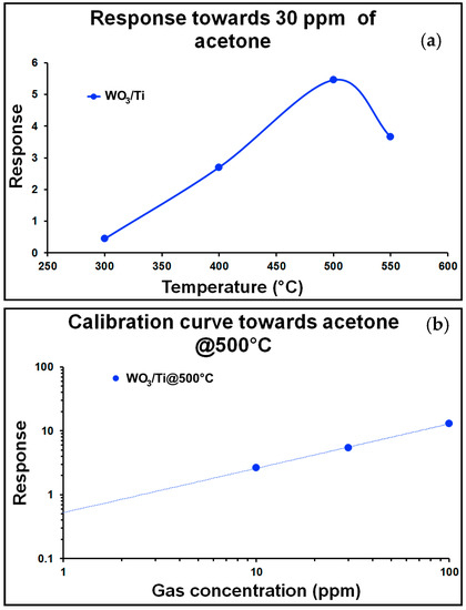 After morphological and structural investigation, several measurements were performed in order to check the ability of chemical sensors based on WO3/Ti nanowires in harmful gases detection. Experiments towards many gaseous species were carried out measuring three different concentration for each gas. The operative temperature of each device was controlled in a range between 200 °C and 550 °C. During all the measurements, the relative humidity was set at 50% @ 20 °C. This work focuses on the acetone sensing performances. For this reason, the response versus temperature (a), the calibration curve at 500 °C (b) and dynamic response at the same working temperature (c) towards acetone are shown in Figure 3.