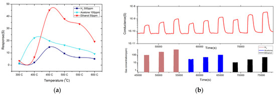 (a) Dynamic response of MoO3 nanostructures toward H2, Acetone and Ethanol at 450 °C.; (b) Response towards H2, Acetone and Ethanol in different working temperatures. RH = 40%, at 20 °C, with an applied voltage equal to 1 V.