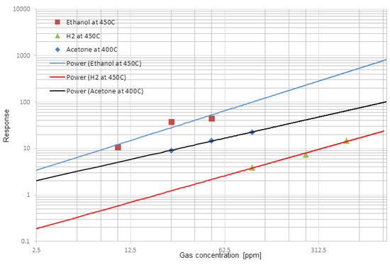 Response towards H2, Acetone and Ethanol in different working temperatures. RH = 40% at 20 °C with applied voltage equal to 1 V.