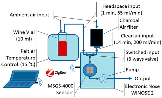 The configuration of the experimental system was adjusted so the stability and sensitivity were optimized. The setup is described in Figure 1. A vial with 10 mL of wine mixture was placed in a Peltier temperature controller at 15 °C. The electronic nose generated a sensor baseline with a 200 mL/min flow rate of charcoal filtered ambient air during 14 min. Then the electronic nose automatically switched the air input to the headspace generated in the vial. A flow rate of 55 mL/min of the sample vial was guided into the electronic nose toward the sensors. The pneumatic system consisted of an air pump, at the exit, that pulled the gases and an electrovalve that switched the input between the filtered air and the wine headspace. The electronic nose had four commercial metal oxide resistive sensors (MSGS-4000, Microsens) heated at 300 °C. The electronic nose was controlled wirelessly (ZigBee) by a software programmed in Testpoint in a personal computer that also recorded the sensor resistances and calculated their responses.