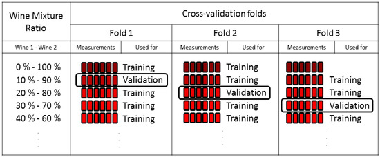 The responses were analyzed by custom scripts programmed in Matlab. Two methods were used to predict the mixture ratio; the first was a Partial Least Squares regression (PLS) and the second was an Artificial Neural Network (ANN) in a multilayer perceptron configuration with a hidden layer of five neurons. Both methods were cross-validated with validation sets consisting of all the measurements of the mixture ratio being predicted and the training data was the rest of the measurements as explained in Figure 2 in which the 3 first folds are shown. All data and plots shown are the final validation results.