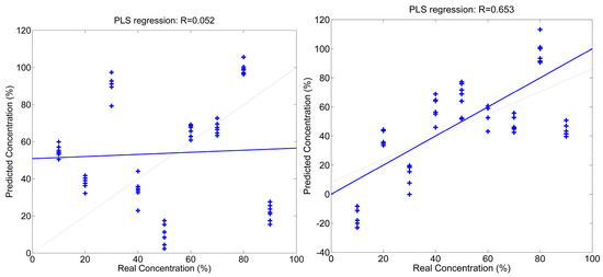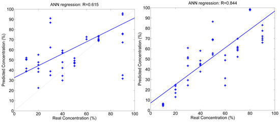 The Figure 3 and Figure 4 show the regression data of the PLS and ANN predictions respectively. Each point represents one measurement. For the white wines, the X-axis is the real concentration of the Malvasía 271 wine in the mixture. For the red wines the X-axis is the real concentration of the Tempranillo wine in the mixture. The Y-axis is the predicted concentration. To evaluate the performance of the validated predictions a linear regression was calculated and it is shown as a solid line in the graphics. The Root mean square error (RMSE) and regression coefficients (R) have been compiled in Table 1.